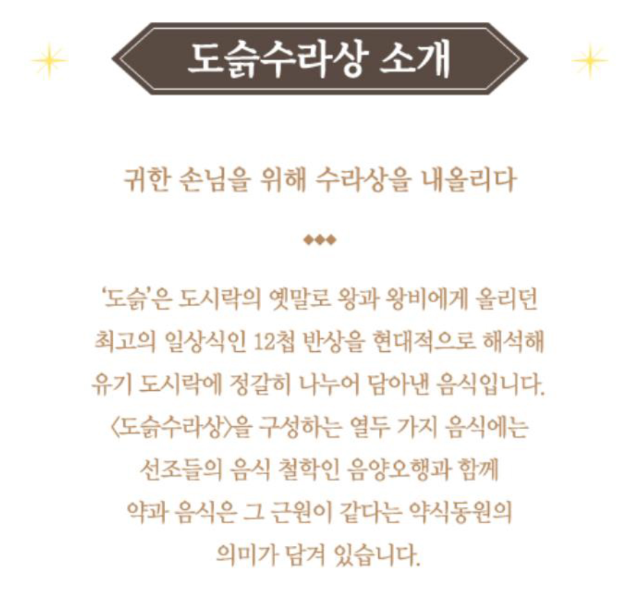 도슭은 도시락의 옛말로, 왕과 왕비가 받았던 12첩 반상을 현대적으로 재해석하여 선보이는 메뉴라고 합니다.