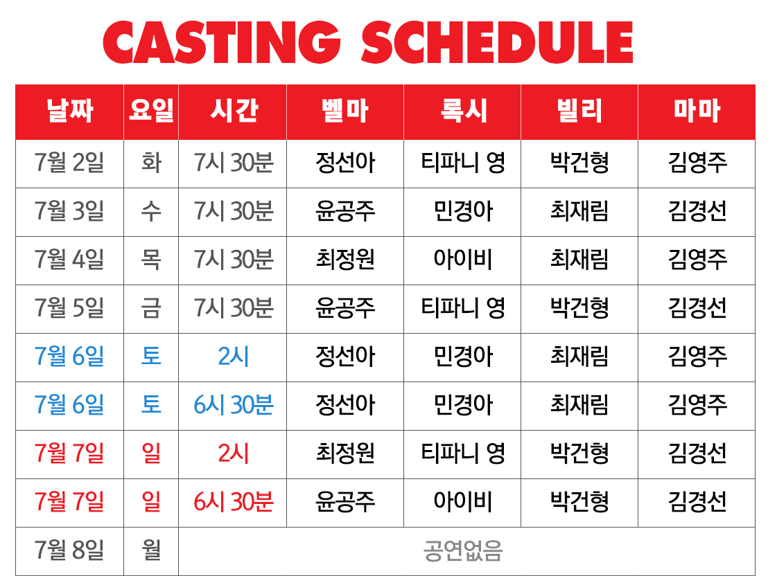 전체 캐스팅 스케줄표는 공식 예매 사이트에 게시되어 있습니다.