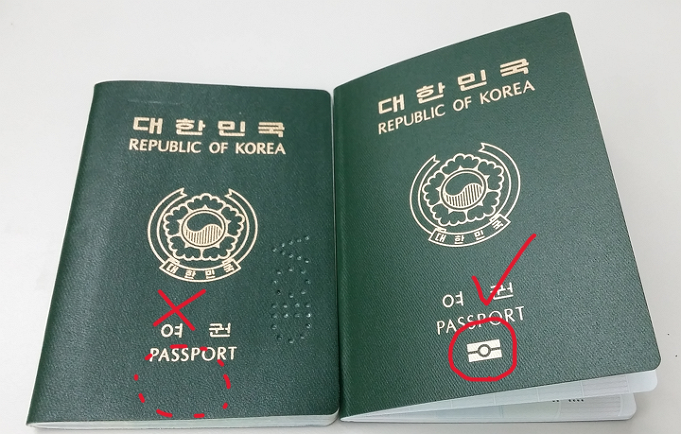 왼쪽에 마크가 없는 것이 일반여권, 오른쪽에 전자칩 마크가 있는 것이 전자여권입니다.