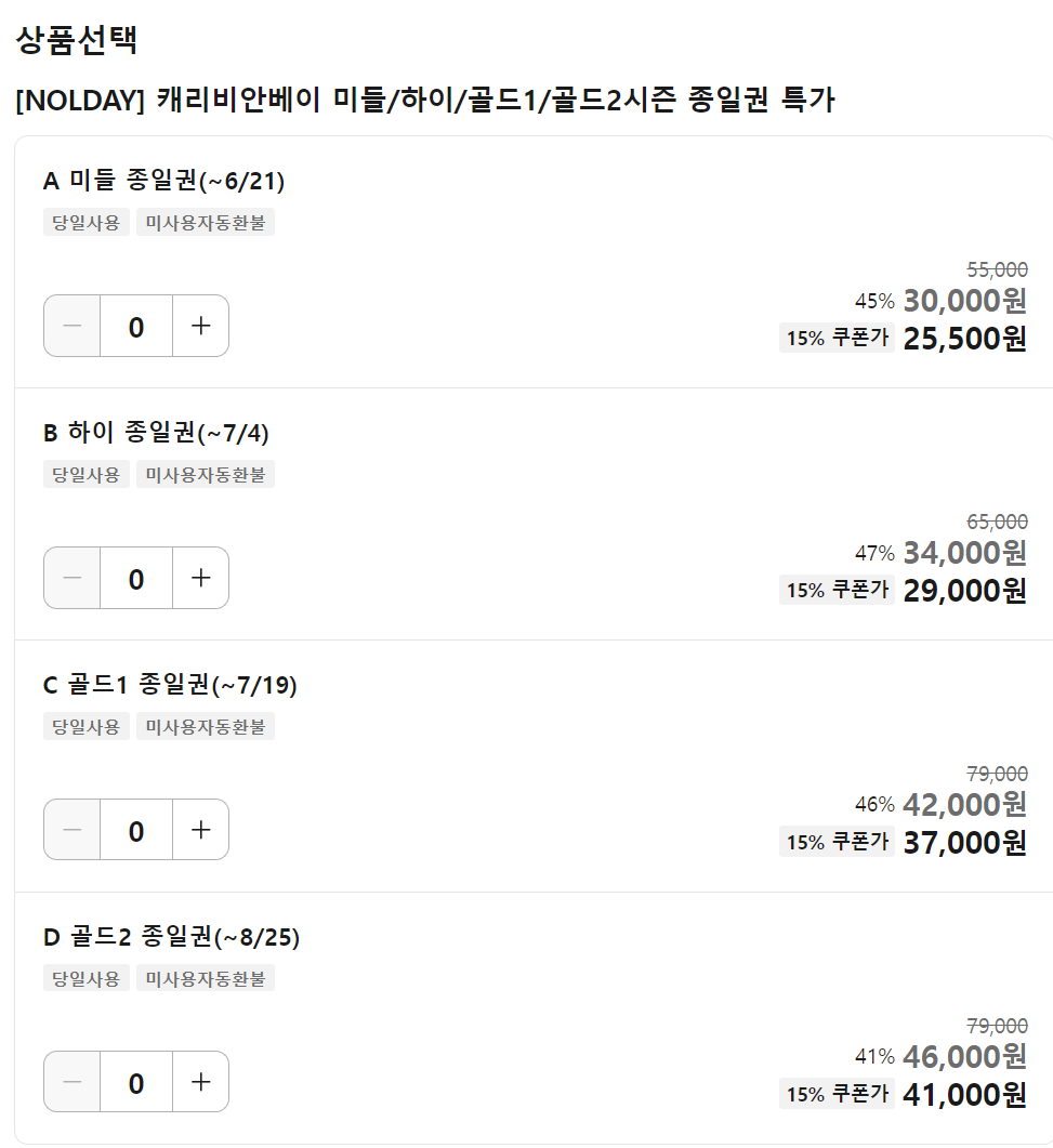 캐리비안베이는 입장일에 따라 구매하셔야 하는 입장권이 다르고 가격도 다릅니다.