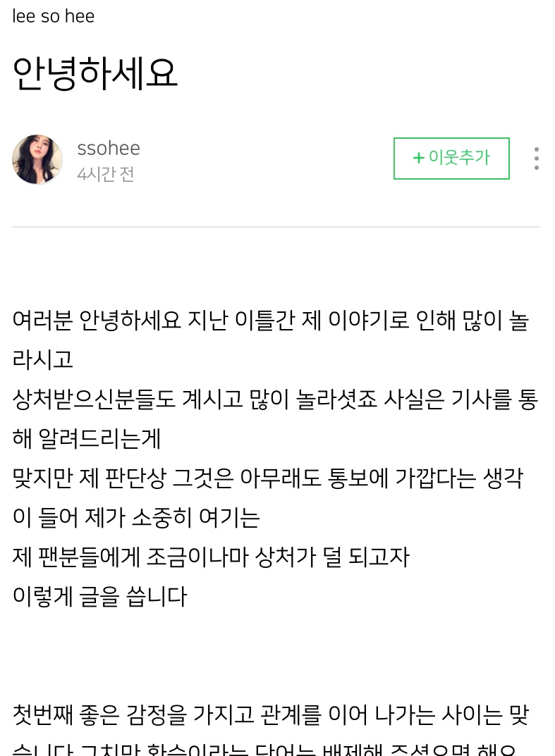 여러분 안녕하세요 지난 이틀간 제 이야기로 인해 많이 놀라시고 상처받으신분들도 계시고 많이 놀라셧죠 ...